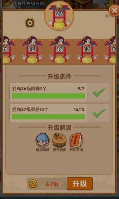 玩到27级了,越往后金币的进账和店铺升级所需的金额差距就越大,挂四个小时连1%的进度都涨不了,只能靠看广告硬往上推。