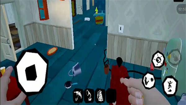 制作组曾经大肆宣扬过邻居的AI是极其先进的,如果仅以邻居的进攻性来看,所言非虚。一丁点的风吹草动都可以引起邻居的察觉,哪怕你只是躲在一个储物间里瑟瑟发抖,邻居有的时候也会找到你,简直如有顺风耳千里眼加持一般。当然,玩家也可以反过来利用这一点,利用小道具声东击西,将邻居引开,不过时间并不长。若是玩家过于依赖使用同一种方法,邻居会使出针对性的对策来埋伏玩家——比如玩家喜欢从前门突破,那么下一次前门的屋檐上可能会设置水桶陷阱;倘若你青睐从后院偷偷摸摸行动,那么可能下一次翻进去的时候等待着你的就是一个捕兽夹。总之,具有一定学习性的AI的确会迫使玩家使用不同的策略,给游戏提供了更多玩法深度。
