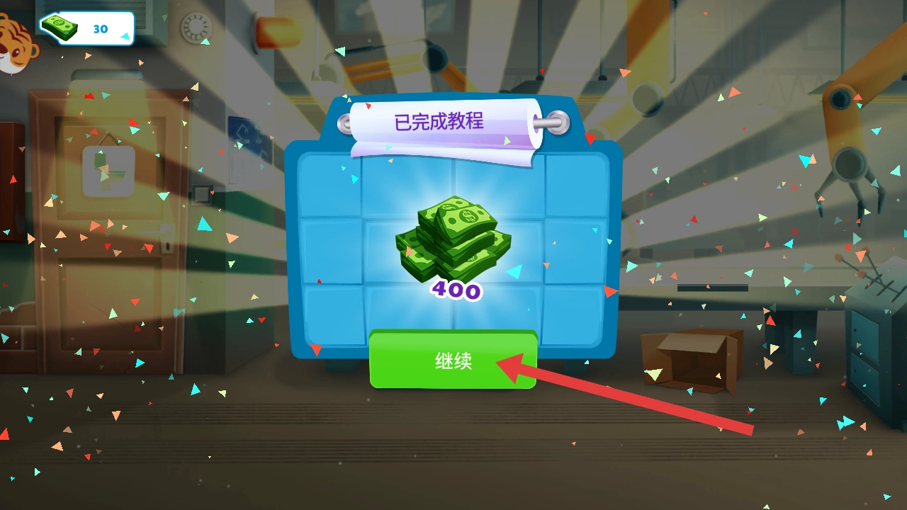 4、完成教程关卡后,会获得400钞票奖励,点击继续按钮,可进入后续的工厂解谜关卡,开启新的挑战。