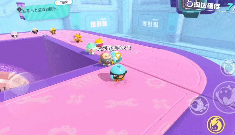 除了基础的跑、跳、飞扑动作外,我们还能启用一个技能类的“滚蛋”机制。开启后蛋仔会化作圆球向前滚动,移动速度较快且能跳跃,但一旦发生碰撞就会产生明显反弹,因此更适合在障碍物较少的场景使用,像竞速赛里的直道段,或是用来快速穿越机关地板区域。