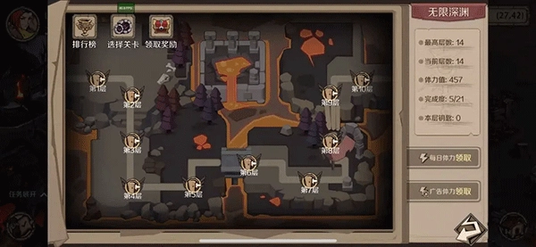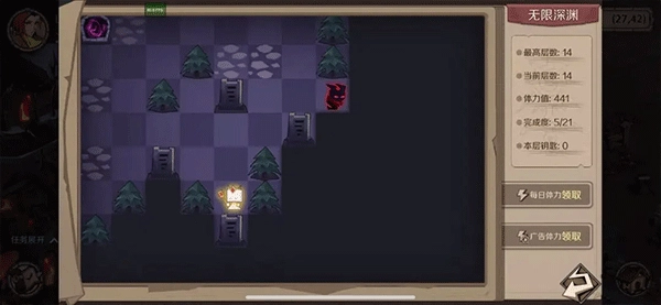 深渊挑战副本类似于迷宫,通过打败格子的野怪获得经验,材料,宝石碎片。挑战深渊副本需要消耗体力值,体力值每天都会恢复,同时还可以通过每日体力领取和看广告获得免费体力(观看广告获得体力暂时还未开放)。游戏前期,深渊挑战是必不可少的一个去处,能够获得大量的经验,提升技能等级的阅历,铜币,提升战斗力的宝石碎片,同时每日奖励也能领到一定的材料。