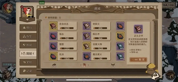 大家可以看到,上面的是擂台赛可以兑换的一些高级材料、高级技能书以及特有的人物英雄,这些都需要勇者金币进行兑换,金币的获得主要是依靠PVP的段位,需要玩家去勇敢挑战别人。如果前期战斗力较低,可以考虑每天简单打一把,摸一下,依靠积分排名获得金币,积少成多。当然,通过不断的PVP,可以提升人物的战斗力、冲击更高的排名段位、获得更多的勇者金币。同时不要忘了调整自己的队伍阵型,搭配出更加强劲的队伍,提高自己的防守能力(排名高,别人可是会用放大镜研究你的阵容,以你为标杆,打败你!)