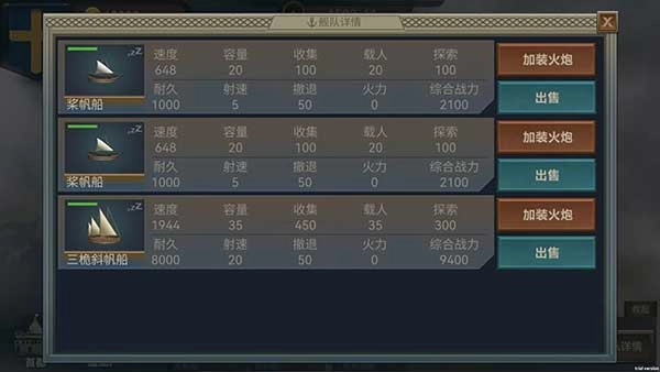 6、在“舰队详情”界面,你能查看已拥有战舰的具体信息,也可以为战舰加装火炮,或者一键出售战舰;而在“造船厂”里,你可以使用金币建造更强大的战舰。