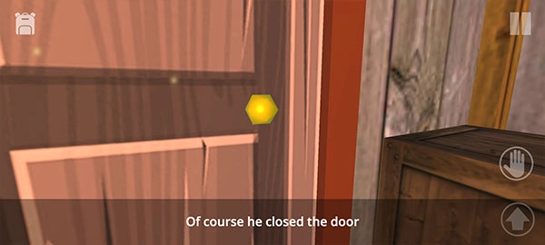 6、意识到自己被囚禁后,移动至门边点击手掌图标,会触发相应动作,但门无法开启,需寻找其他逃生途径。