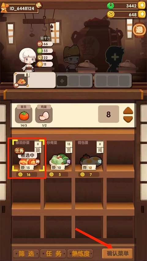 8、进入厨房界面,按照要求挑选对应的食材后,点击右下角的【确认菜单】按钮。