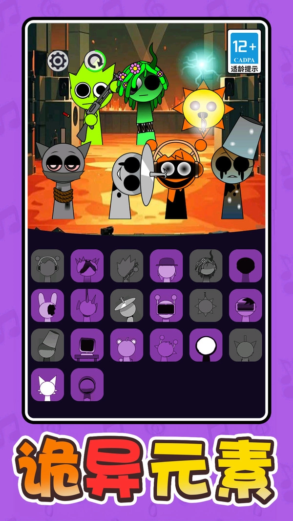 游戏由上下两个部分构成,上方是小人角色,下方则排列着各种音乐相关的道具。