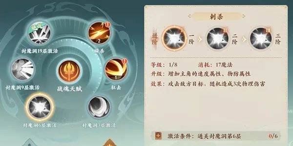 1技能:分身斩,群体3目标。(2阶:增加1目标、3阶:技能伤害结果额外增加10%)