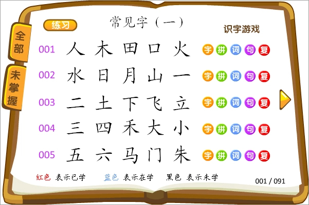 2、识字学堂,2000多个常用汉字,9000多个配套词组;
