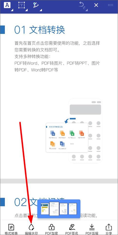 3、打开文件后,下方功能栏有格式转换、分享、PDF加密、压缩等,点击编辑水印;
