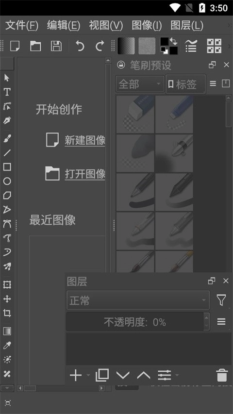 第一次启动 Krita 时,窗口的中央不会立即显示画布视图。大家需要打开画布视图,你必须新建或者打开一个图像。你可以在欢迎屏幕点击 新建图像 ,也可以前往主菜单的 文件 ‣ 新建 ,Krita 将打开一个新建图像对话框。要打开已有文件,你可以在欢迎屏幕点击 打开图像 ,也可以前往主菜单的 文件 ‣ 打开 ,还可以将图像文件从系统的文件管理器直接拖进 Krita 的窗口。
