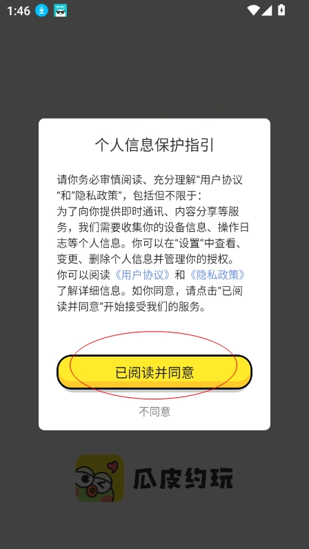 1、安装后打开软件,提示同意与否,点击同意进入注册界面;