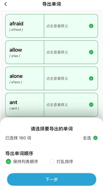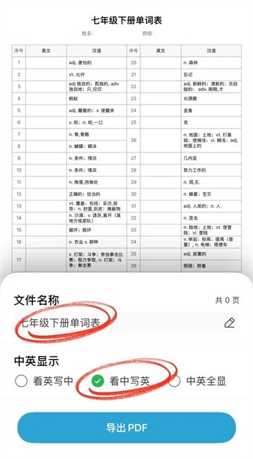 5. 导出单词为PDF:在背单词页面点击“导出单词”按钮,勾选需要导出的单词,为文件设置名称。随后,从三种模式(看英文写中文、看中文写英文、中英全部显示)里任选一种完成导出操作。