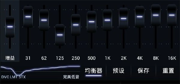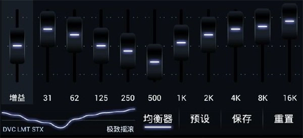 三:第三个均衡器我称之为“最毒人声”,之所以称之为最毒人声,就是因为这种均衡器设置的中频人声特别突出,但是,这个均衡器设置的三频又十分的均衡,同样的清丽通透,听感十分舒服,使人久听不累。从左至右开始:增益:0;第一频段:+4;第二频段:0;第三频段:+1;第四频段:+2;第五频段:+3;第六频段:+4;第七频段:+5;第八频段:+4;第九频段:+3;第十频段:+3