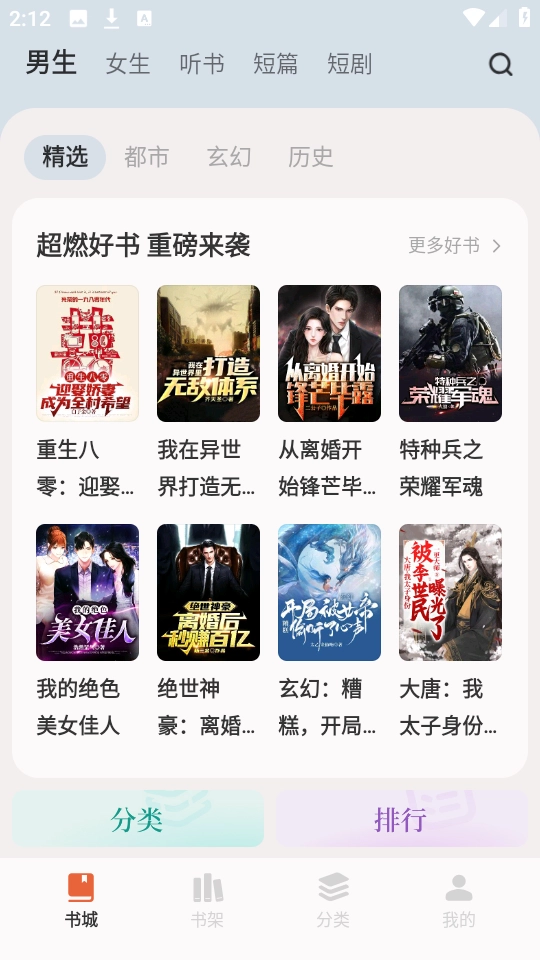 2、首页分类一目了然,包含精选、都市、玄幻、历史等多样题材的小说内容,方便您随心挑选。