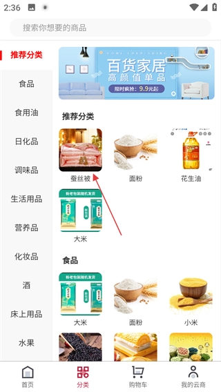 在分类页面,点击“蚕丝被”选项,即可进入蚕丝被商品列表页面。