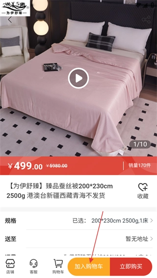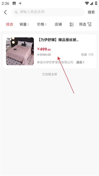 3、在蚕丝被商品列表页面,点击为伊舒臻臻品蚕丝被商品,进入商品详情页面。